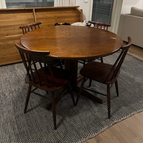 Myydään kaunis Suomessa valmistettu vanha ruokailuryhmä. Pöytä+4 tuolia. Tuoleissa punainen kangas, mutta alla beige/harmaa istuinosan verhoilu.