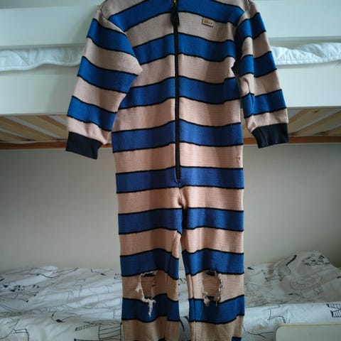 Merinovillahaalari kokoa 110. Muuten hyvä kunto, mutta useampi pieni reikä. Meillä oli käytössä ihan näin, mutta toki korjaamalla saisi nätimmän.