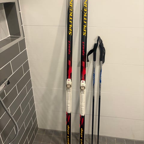 Myydään sukset 160 cm ja sauvat 125 cm.