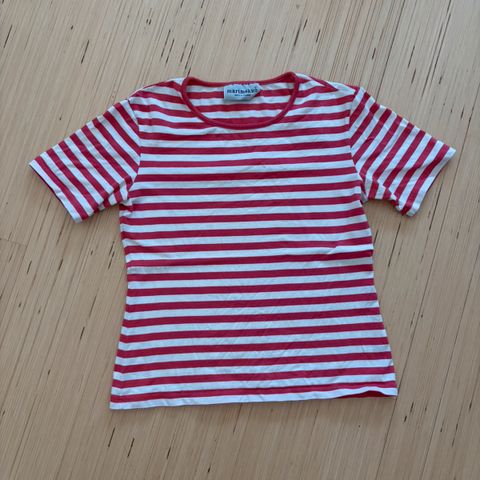 Marimekko T-paita, koko S, väriltään vihreä. Materiaalina ainakin puuvilla, mutta materiaalilappua ei ole. Venyy kuitenkin.Naisten vaate.