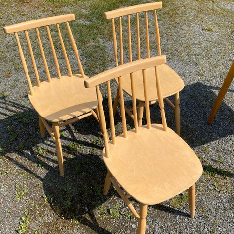 Annetaan 6 kpl mustaksi maalattuja 60-luvun pinnatuoleja. Kaikissa on kulumaa ja naarmuja, mutta neljässä tuolissa on isompia koiranpennun tekemiä vaurioita. Jalkoja on järsitty ja istuimen viiluakin maisteltu..