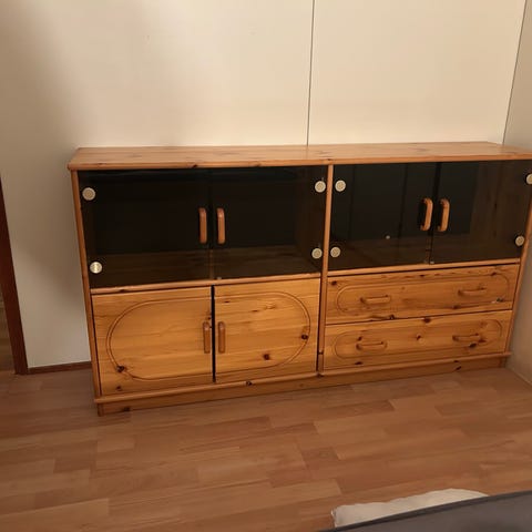Myydään hyväkuntoinen lipasto 180 cm leveä, lasilla.