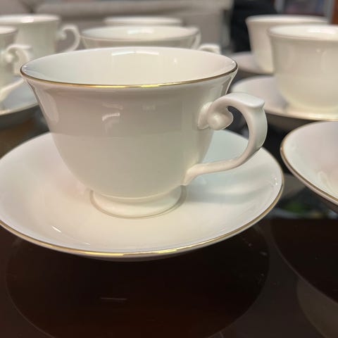 Arabia kulta-punaraita astiasto. Sekalainen määrä erilaisia tarjoiluvateja sekä lautasia. Myös kahvikupit löytyy. Kysy lisää niin kerron tarkemmin.