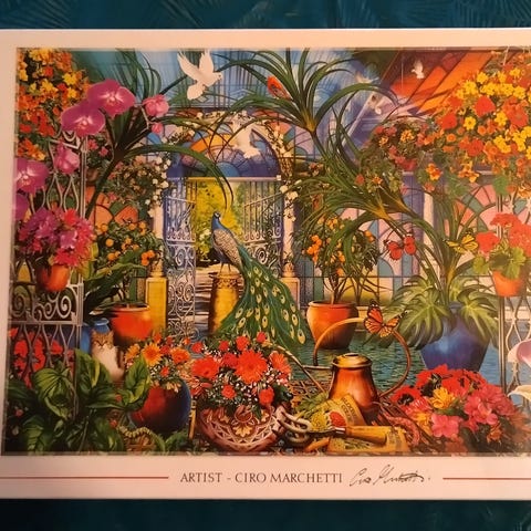 Trefl merkkinen palapeli 1000 palaa. Puutarha aiheinen keväinen kuva. Kukat, kuokat, siemenet, saappaat ja kirja. Hyvät palat rakentaa peliä. Uutena ostettu ja kerran tehty uudenveroinen palapeli. Kaikki palat tallella.