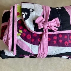 Aluslakana, tyynyliina ja kevytpeitto samassa näppärässä unipussissa. Valmistajan ilmoittama koko 90x250 tyynyliinan kanssa, en nyt itse mitannut. Peiton tikkaus purkautunut pieneltä matkalta ja suuaukon reunassa rikko. Pitäisi näkyä kuvissa luotettavasti. Käsistään kätevä ompelukoneen omistava saisi varmaan vielä korjattua.