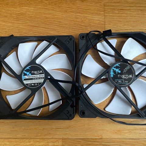 3 x ID-Coolingin 120 mm 4-pin PWM tuulettimia vihreillä LEDeillä. Yhdestä tuulettimesta yksi nurkka repsahtanut toiselta puolelta, eipä tolla mitään vaikutusta toimivuuteen.