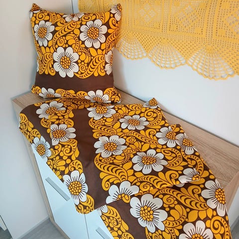 Kangas on kohokuvioitua laadukasta Eurokankaan sisustuskangasta, josta ei enää kylläkään ole tarkempia tuotetietoja tallessa.