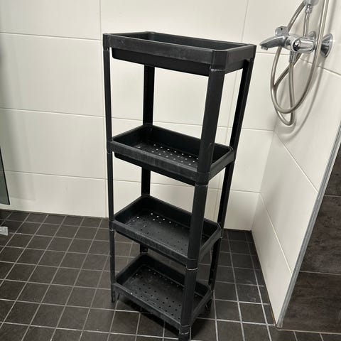 Metallinen musta hyllyvaunu pyörillä