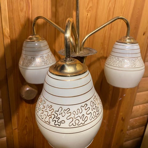 Todella kaunis 1950-luvun romanttinen Sarion valaisintehtaan 5-kupuinen messinkivalaisin vanhoilla opaalilasikuvuilla (valmistajan leima rungossa - viimeinen kuva). Valaisimessa on kauniisti patinoitunut messinkirunko ja romanttisen koristeelliset sähköosien päällä olevat messinkiset kupit ja mansetit. Valaisimessa on lisäksi todella hienot messinkiset kiiltävät lehtikoristeet rungon keskiössä ja messinkiset jousikoristeet sekä alakuvun että mansettien alla. Valaisin on varustettu Riihimäen lasitehtaan tuotannossa 1950-luvulla valmistetuilla vanhoilla pyöreämuotoisilla valaistusaukostaan rypytetyillä täysin ehjillä opaalilasikuvuilla, joiden läpi valo siivilöityy lämpimästi ja valaisee häikäisemättömästi viidellä valopisteellä suuremmankin huoneen. Kuvut on esitelty esim. Itsun vuoden 1956 kuvastossa mallinumerolla 1406 maalattu väriopaalikupu ja näitä kupuja käyttivät valaisintehtaat Suomessa yleisesti. Valaisimessa on aikakautensa mukaiset sähköosat ja maadoittamattomat sähköt. Uudet led-polttimot sisältyvät hintaan. Valaisinpistokkeesta voidaan sopia tarpeen mukaan erikseen.