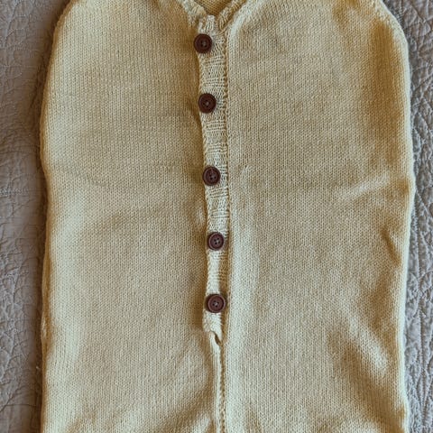 Neulottu vauvan unipussi. Tämä on ehkä jotakin silkkivillalankaa, tosi pehmoinen ja lämmin. Meillä oli käytössä puolen vuoden paikkeilla. Alaosassa nepparit vaipanvaihtoa varten. 30 €+pk.