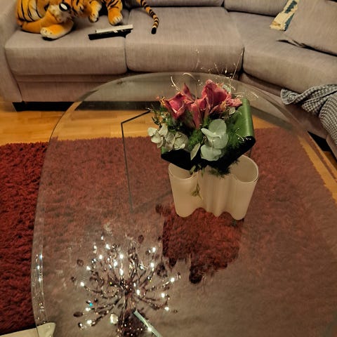 Kaunis lasinen sohvapöytä.
