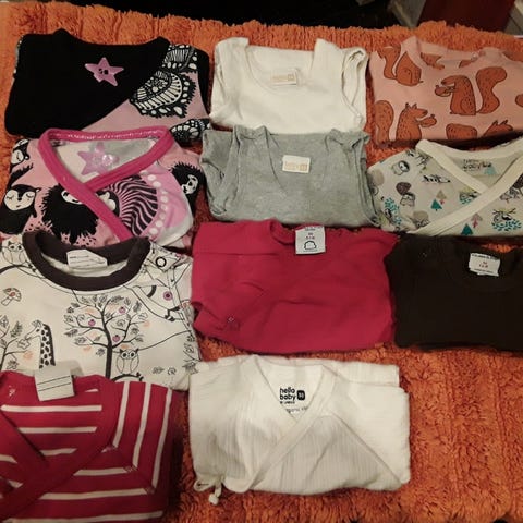 Ehyet ja siistit bodyt koossa 62-68. Polarn O Pyret, Kuutti, Lindex, Name It, DIY ym. 2-5 €/kpl merkistä riippuen. Mmm.