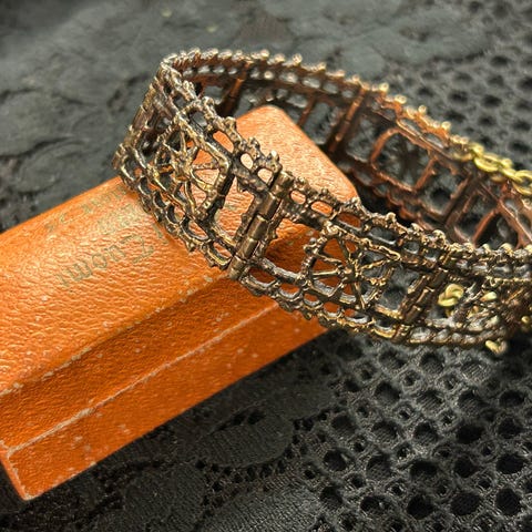 Pentti Sarpanevan suunnittelema Turun hopean pronssinen Pitsi rannekoru. Pituus 18cm ja leveys 18mm. Nouto Lahden Saksalasta.