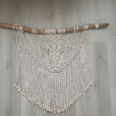 Myyntiin ALE hintaan uusi itse tehty vaaleanharmaa makramee seinävaate.