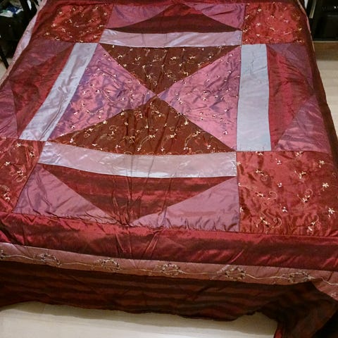 Päiväpeitteen molemmilla puolilla on Unikko-kuosi. Peitteen pehmuste on valmistettu 100-prosenttisesti kierrätetystä polyesterista.