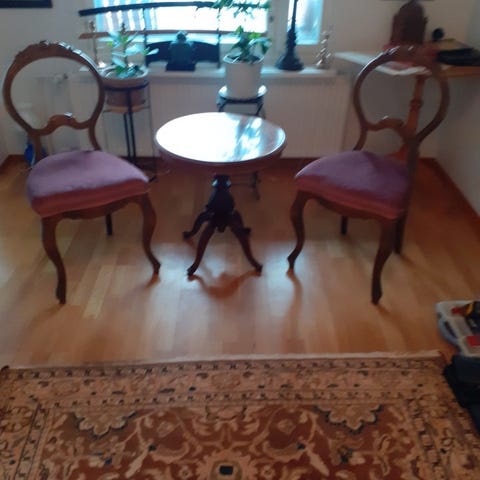Pikkutuolit vaikka eteiseen ja varalle. Nätti biedermeier-kangas. Selän korkeus 88 cm, istuinkorkeus 45 cm, istuimen etuosa lev 45. Toisen tuolin takana pieni lista rikki. Ei haittaa käytössä. Yhteishinta 80 €,
