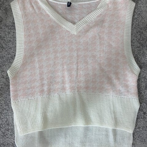 Liivi isolla hupulla, harmaa-valkoinen. Tilattu Etsy:stä, vain muutaman kerran pidetty. Käsinkudottu.
