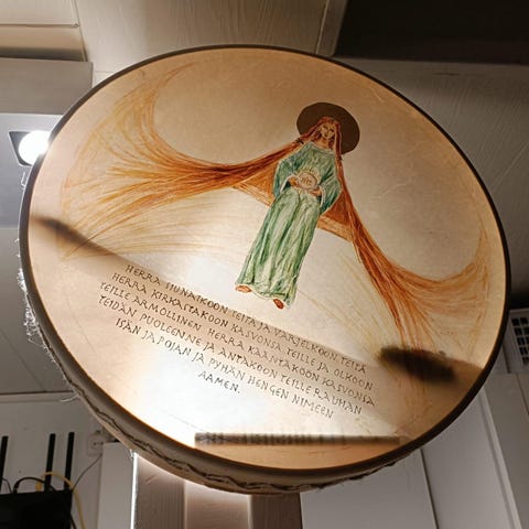 Myydään itse tehty shamaanirumpu. Rumpu on saanut niin sanotun rumpukasteen ja nimekseen Tulilintu. Se on vihitty käyttöön soidakseen rakkauden voimalla. Rumpu on kokoa 45cm. Se on tehty koivuvanerista ja poronnahkasta. Kahva on pihlajasta ja se on kiinnitetty rumpuun tukevasti nahkahihnoilla. Rumpu on värjätty petsiväreillä. Väritys on hyvin monivivahteinen, vaikka ensisilmäyksellä näyttääkin mustan ruskealta. Valoa vasten näkyy värit näkyy parhaiten. Rumpu on valmistettu kesällä 2025. Rummun kapula ei kuulu kauppaan, pelkkä rumpu myynnissä.