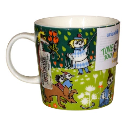Jokaisesta myydystä tuotteesta lahjoitettiin kaksi euroa UNICEFille lasten koulutuksen tukemiseen ympäri maailmaa. Mukit suunniteltiin Suomessa ja valmistettiin Thaimaassa. Värikäs kuvitus vaikeuttaakin mahdollisten tehdasvirheiden havaitsemista, joten suurin osa tarrallisista mukeista päätyy kuntoluokkaan "superhyvä". Tosin joissakin mukeissa iso tarra repsottaa reilusti, jolloin laitamme tälläisen mukin kuntoluokkaan "aivan hyvä".