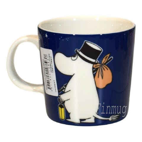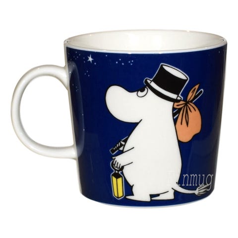 Tämä tunnelmallinen syvänsininen muki korvasi vuonna 2014 klassisen mustan Muumipappa-mukin ja pysyi tuotannossa vuoteen 2022 asti, jolloin sen korvasi uusi harmaa Muumipappa-muki.