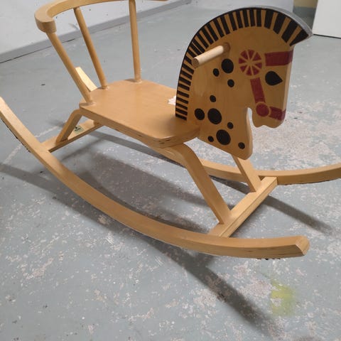 Myydään puinen keinuhevonen. Kulumisjälkiä on.