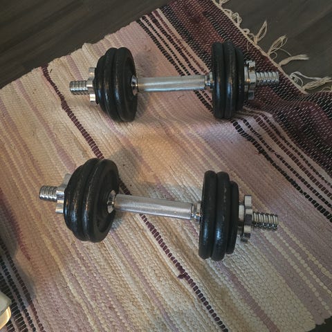 Settiin kuuluu: 4 x 2,5kg painolevyjä, 4 x 1,25kg painolevyjä, 4 kierrelukkoa, 2 tankoa, jotka ovat pituudeltaan 35cm ja halkaisijaltaan 3cm.