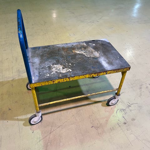 Pyörillä liikutettava työpöytä kolmella tasolla.