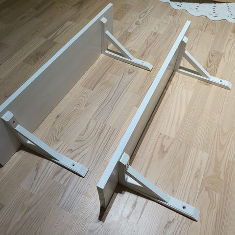 Myydään 2 kpl valkoisia seinähyllyjä. Kahdessa hyllylevyssä näkyvämpiä käytön jälkiä (kts. kuvat). Kehikot uudet ja käyttänättömät. Mukana ruuvit seinään kiinnitystä varten.