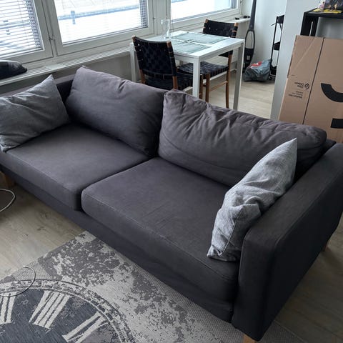 Pehmeä ja mukava, selkä tyynyt ovat irrotava sekä on vetoketju että voit pestää. Myyn kaikki kotisisustukset koska muutanpois niin jos on jotain mielessä että haluat kotiin voit kysyä jos se löytyy minulle sekä matto joka näkyy kuvassa on myynissä se näkyy tilissä.