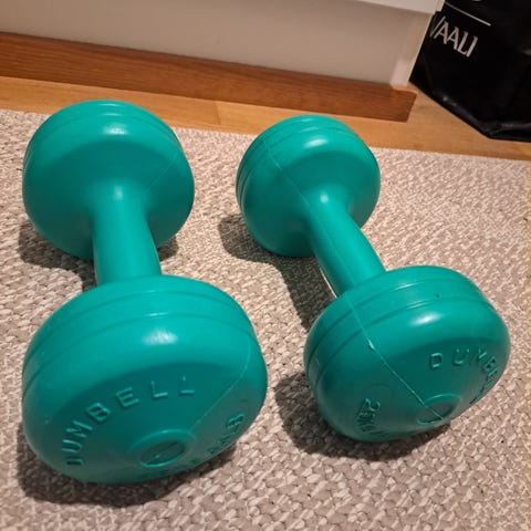 Käsipainot, paino 3 kg kpl, keltainen väri, muovipäällysteinen pinta. Sopii yleiseen voimaharjoitteluun ja kuntosaliharjoitteluun. Yhteishintaan 5 €. Nouto Tikkurilasta.