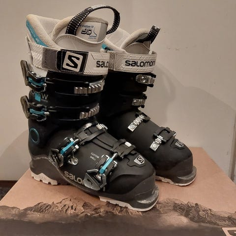 Salomon X Pro 90 Laskettelumonot, koko 24 , värit musta ja valkoinen. Monot on varustettu kolmella soljella ja tarrakiinnityksellä. Sisävuori on pehmeä ja lämpöä eristävä, lasketteluun.