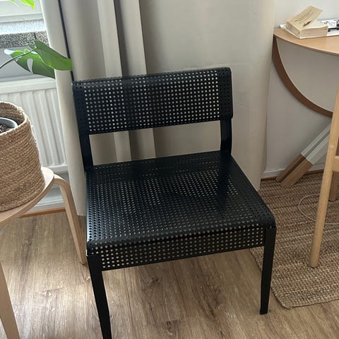 Musta metallinen tuoli, tolix -tyylinen. Pehmusteen saa mukaan.