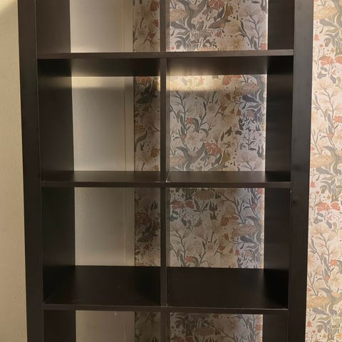 Ikean valmistama Expedit niminen tummanruskea hylly, nykyään nimi netissä Kallax.
