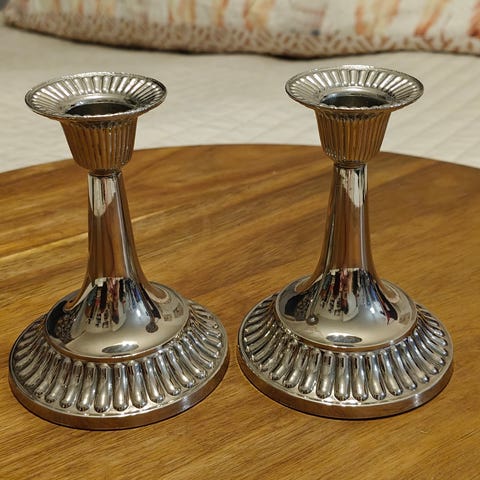 Todella nättejä metallisia kynttilänjalkoja, toinen hieman pidempi. Todella hyväkuntoiset mutta toisessa pohjassa pieni kohta josta pinta lähtenyt , eikä onneksi huomaa käytössä 😊
