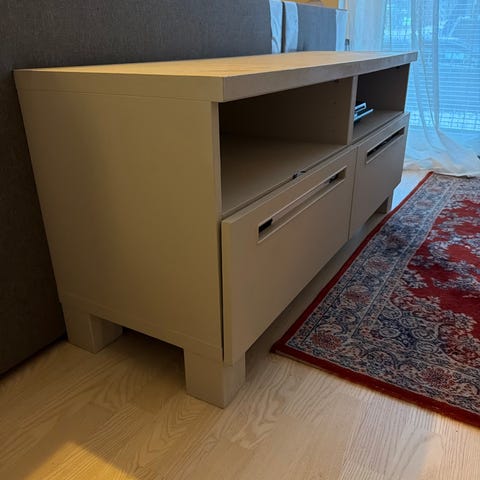 Annetaan tv-taso alunperin askosta. Kannessa ja vasemmassa laatikossa on maali vähän lähtenyt (muutossa ollut teipillä kiinni). Katso kuvista tarkemmin. Pienempi malli, sopii hyvin pienempäänkin asuntoon.
