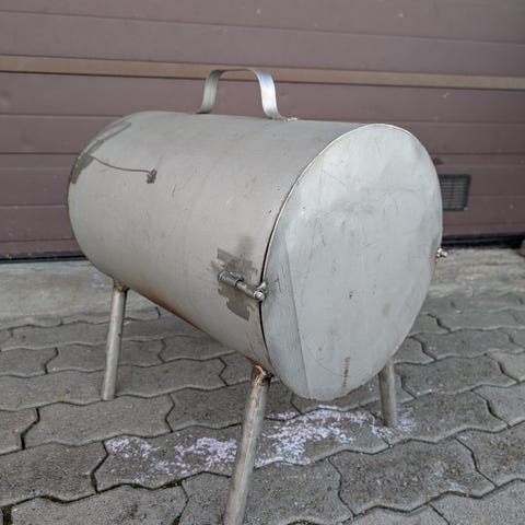 Hyvä savustuspönttö,rujon näköinen,mutta toimiva.Korkeus 24,5cm,syvyys42cm ja leveys 31cm.Painava,tehty ruostumattomasta teräksestä.
