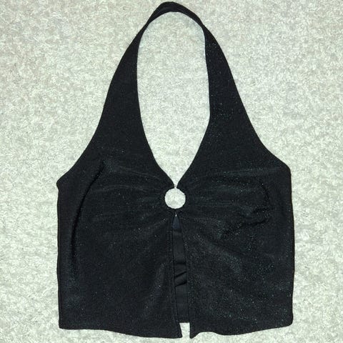 Musta/harmaa kimaltava toppi, vintagea. Ei kokolappua mutta menee parhaiten M/L koolle sanoisin :)