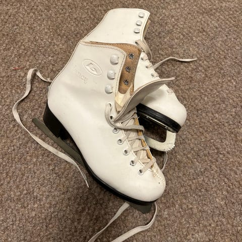 Kaunoluistimet koko 34. Terät on teroitettu viime talvena, ja teroituksen jälkeen luistimilla luisteltu vain muutaman kerran, joten terät ovat vielä hyvässä kunnossa. Luistimet sijaitsee Mynämäen Pöyköllä.
