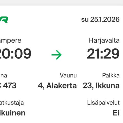 Nokia-Tampere-Helsinki junalippu 24.1