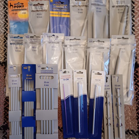 Muoviset pyöröpuikot, sukkapuikot, virkkuukoukut ja Arv-neulelehti (neuleita ja asusteita lapsille) settinä