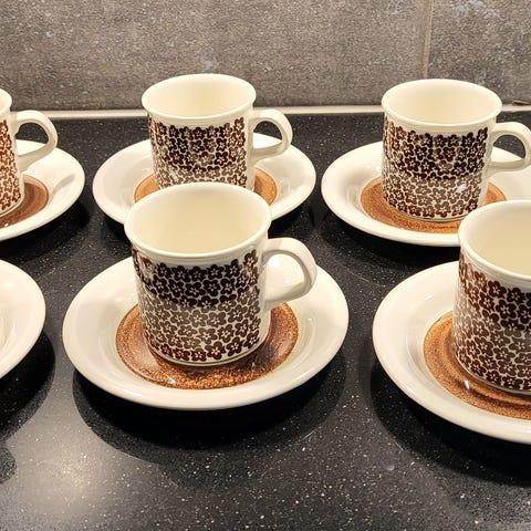 Myydään siistikuntoinen ja ehjä Arabian Faenza ruskea kukka mokkakuppi asetilla.
