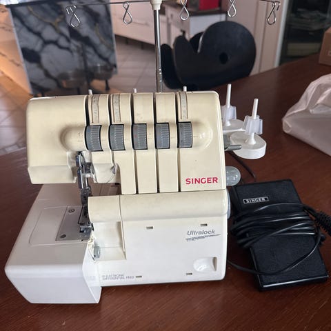 Pieni Singerin kolmilankainen saumuri. Kannattaisi käyttää huollossa, ompelujälki vaihtelee kankaasta riippuen. On kuitenki t-paitoja tällä ommeltu, joten ihan toimiva laite