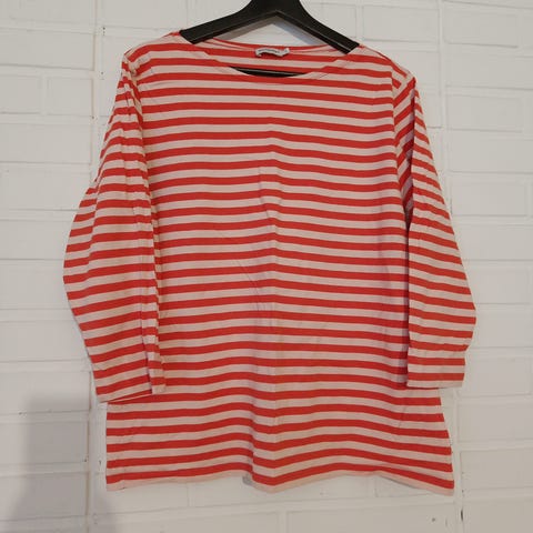 Marimekon tasaraita paita koko 2XL. Ehjä ei venähtänyt, mutta valkoiset raidat tummentuneet pesussa ja muutamia pisaratahroja jotka näkyy kuvissa.