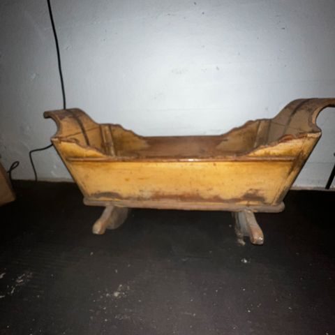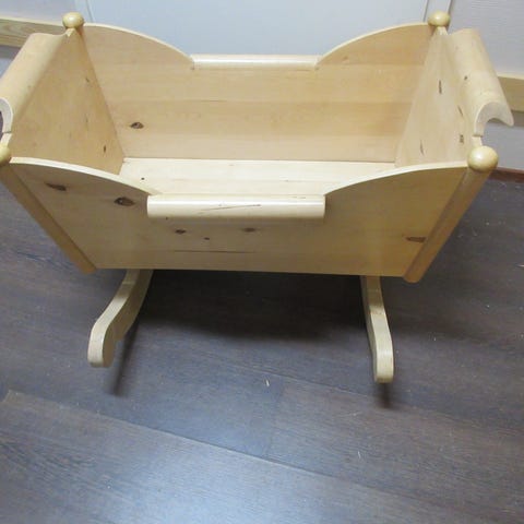 Puuta, eli painava ja hyvin vanha sisätiloissa säilytetty kehto. Nouto Riihimäki.