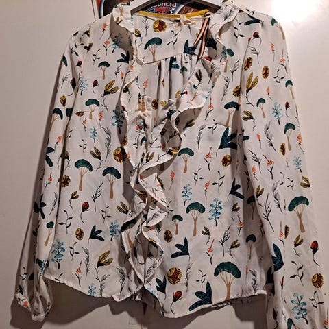 Lindex pusero naisten kokoa 36. Väri murrettu oranssi. Viimeisessä kuvassa värisävy enemmän sitä mitä luonnonvalossa. Puserossa on kullanväriset napit ja koristeellinen röyhelökaulus. Hihat ovat pitkät ja hihansuissa on napit. Kuvioinnissa on lintuaiheita. 100% polyesteri.