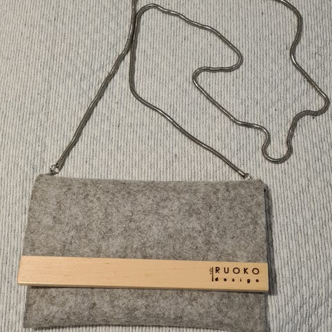 Ruoko Design Kotelo laukku, musta. Luonnossa väri näyttää tummanharmaalta. Materiaali huopa ja visakoivu. Metallisen hihna pituus 115 cm, irrotettavissa. Laukun kannen alla vetoketju ja magneettineppari.