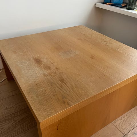 Annetaan nopeimmalle noutajalle Ikean sohvapöytä. Toisella sivulla hylly, toisella laatikko ja kaksi lokeroa. Päällä lasilevy ja pyörät alla.