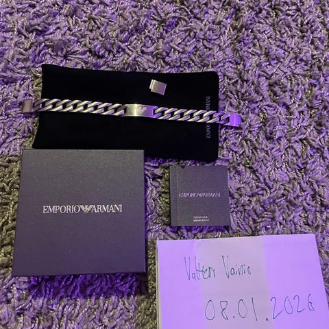 Armani rannekoru ja sormus teräs materiaali. Rannekoru teräs + musta inlay kotkalogo. Sormus teräs mustalla raidalla. Rannekoru 35 € ja sormus 25 €.