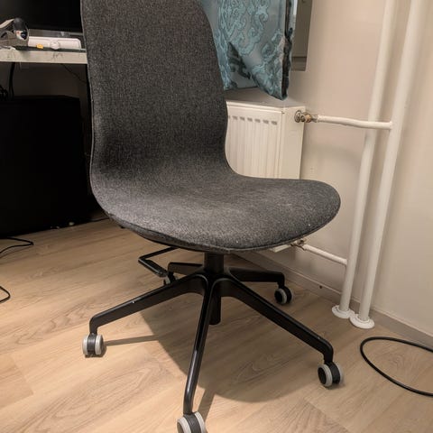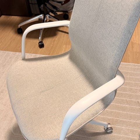 Ikean Långfjäll sarjan työtuoli, valkoinen runko, roosa päällinen. Muutoin siisti, mutta yksi näkyvä tahra etuosassa, jota ei ole yritetty esim. tahranpoistoaineilla tai tekstiilipesurilla poistaa eli saattaa lähteä tai ainakin vaalentua. Huomioitu hinnassa. Ovh. 180e.