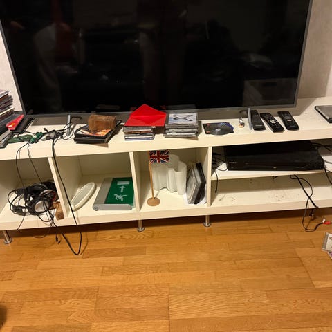 Siistikuntoinen kookas tv-taso. Tavarat ei kuulu kauppaan.
